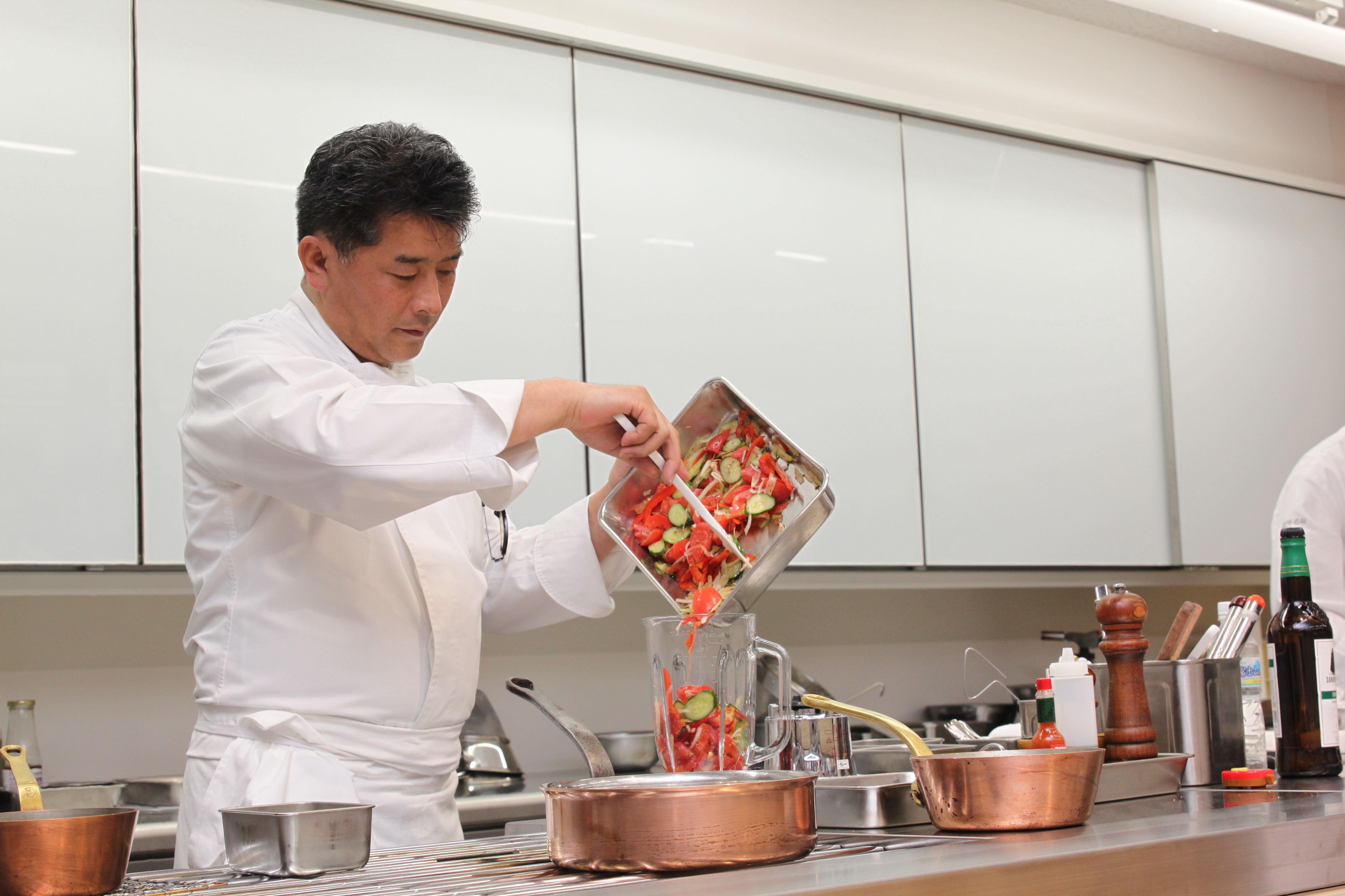 フュメ・ド・ポワッソンを加えて更に煮詰め、生クリームを加えて軽く沸かした後にシノワで漉し、取りおく。